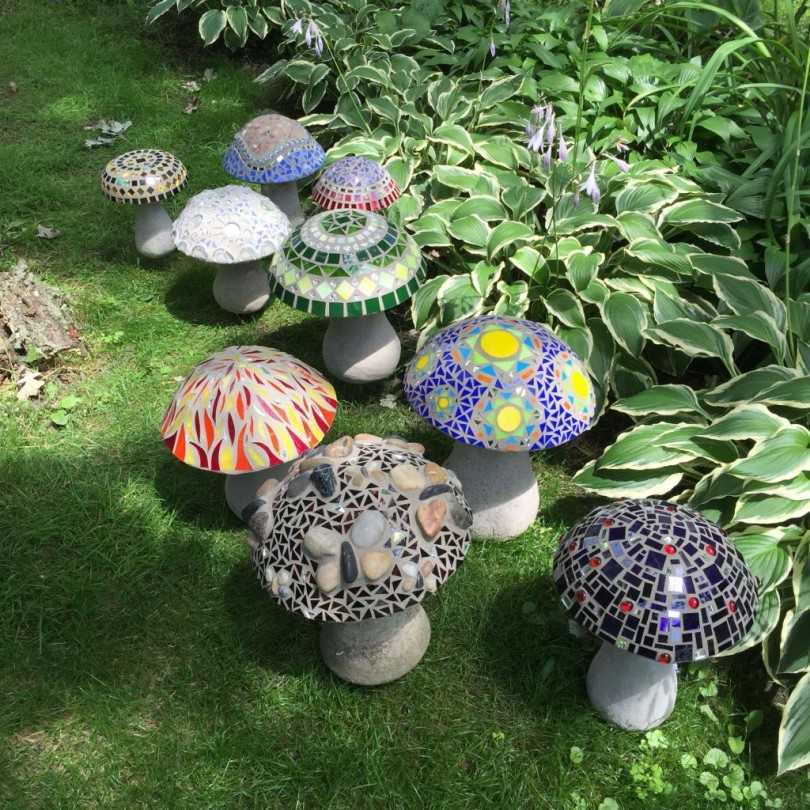 На пне достаточно большого диаметра может расположиться грибная семейка. Его срез окрашивается зеленой краской или покрывается мхом. На мини-полянку высаживаются маленькие грибочки из округлых камней. Для ножки подбирается галька светлого оттенка. Шляпки лучше покрасить в яркий цвет.