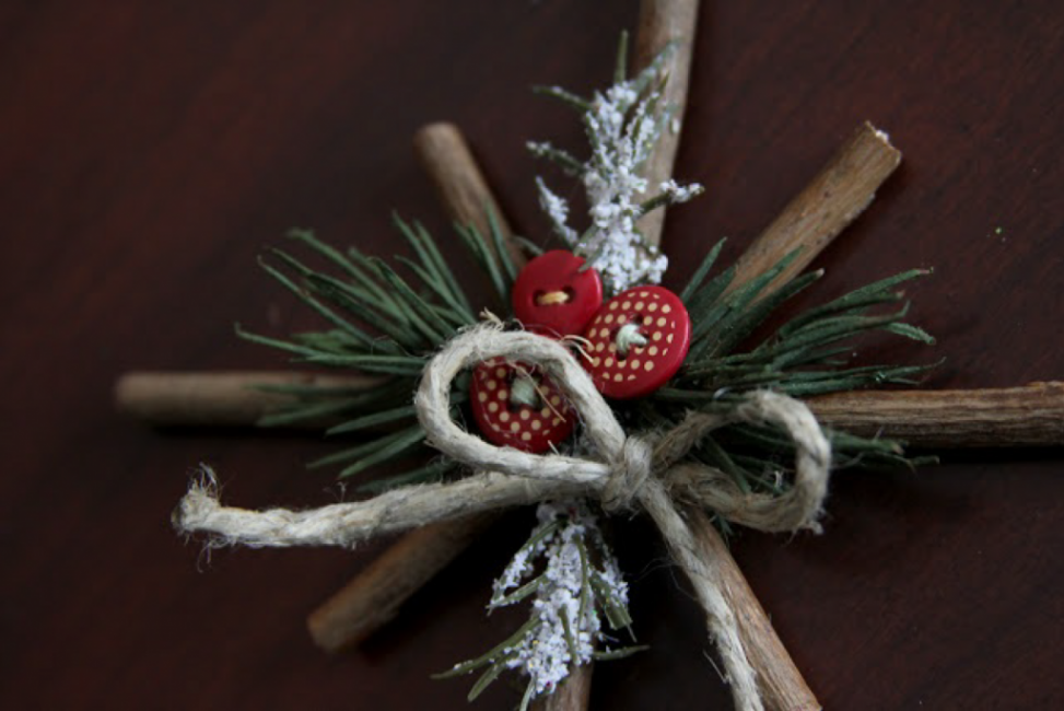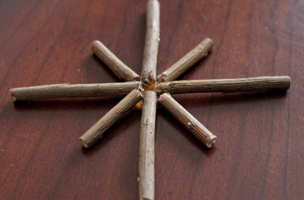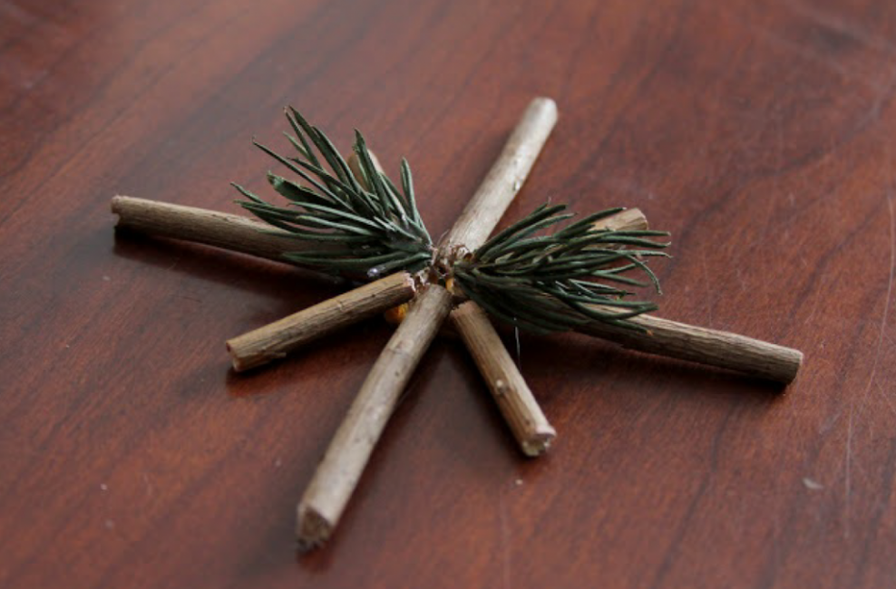 С помощью секатора нарезать веточки так, чтобы сложилась снежинка. Каркас должен состоять из 4 крупных веток длиной по 5-7 см.