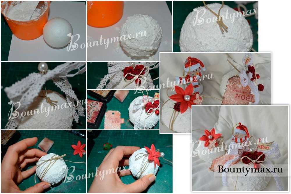 Любителям винтажа понравится следующая идея. На сферу-основу приклеивается кружево, затем подкрашивается для придания старинного вида. (См. также мастер-класс корона из кружева).