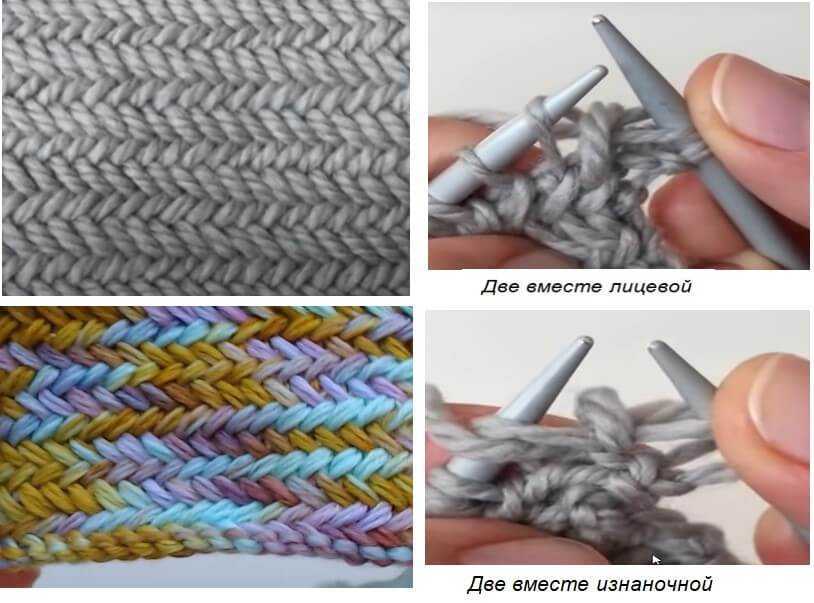 - Две вместе изнаночной. Рабочая нить перед полотном. С иглы спускают только одну из провязанных, а вторую провязывают со следующей.