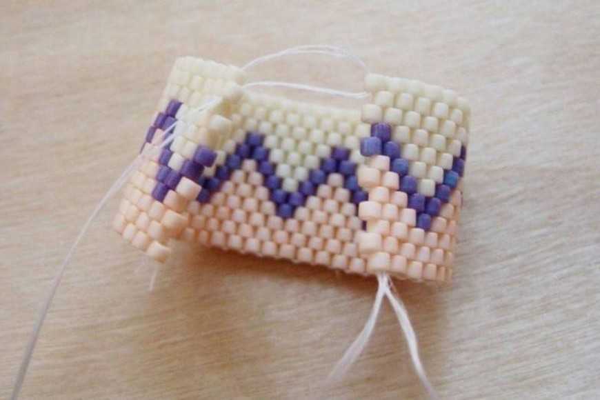 - Пропускаем конец сквозь 1 и 2. Получится как бы 3 рядка. Вторым концом проходим сквозь предкрайний рядок, плетем на 2-х концах — 19 рядков по 2 бусинки.