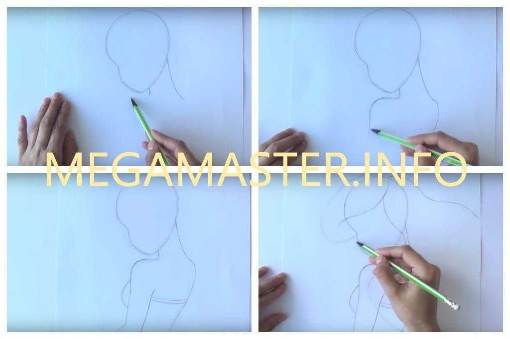 - Опускаемся ниже. Прорисовываем шею, плечи и руки. Русалочка будет повёрнута к нам спиной. Внимательно посмотрите на образец, чтобы понять, как располагается спина.