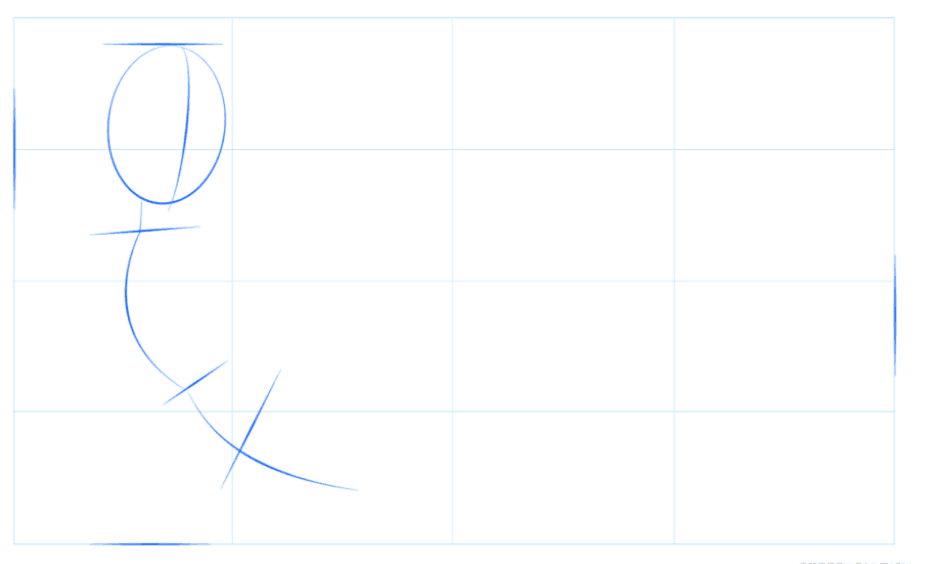 Рисуем контур лица карандашом НВ. Отмечаем на лице вспомогательные линии для построения глаз, носа и рта персонажа.