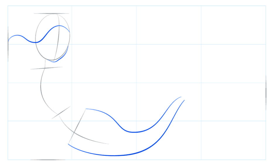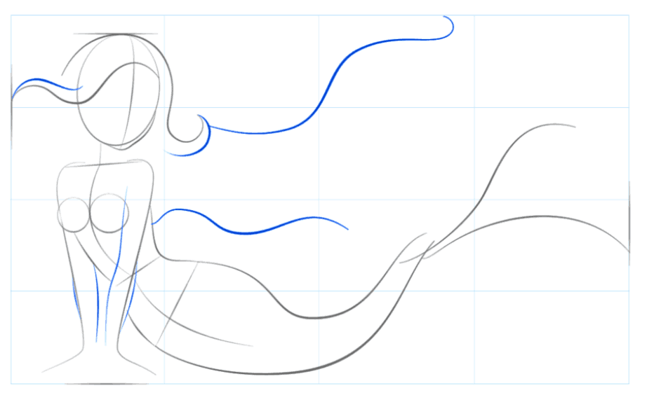 Затем наметим объём её торса и основные направляющие линии для хвоста и рук.