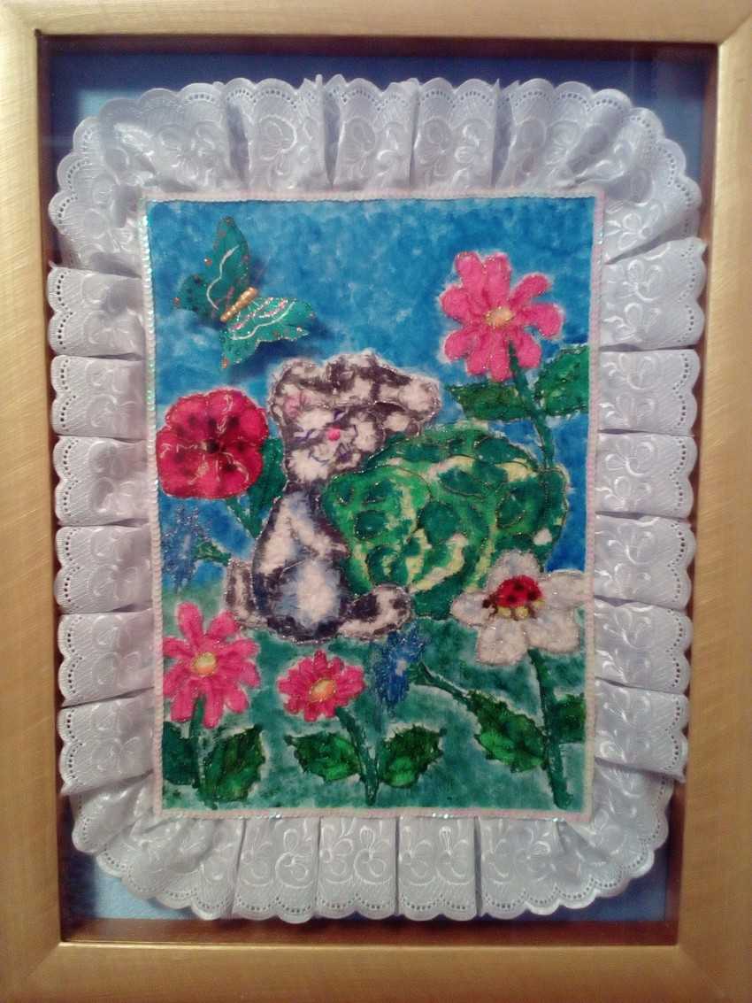 Уместно дополнять подобные панно цветами и фигурками, вырезанными из фетра или фланели. Поиграйте с фактурой, используйте кружево, тесьму, ленты, пуговки – и у вас получится дизайнерская вещь.