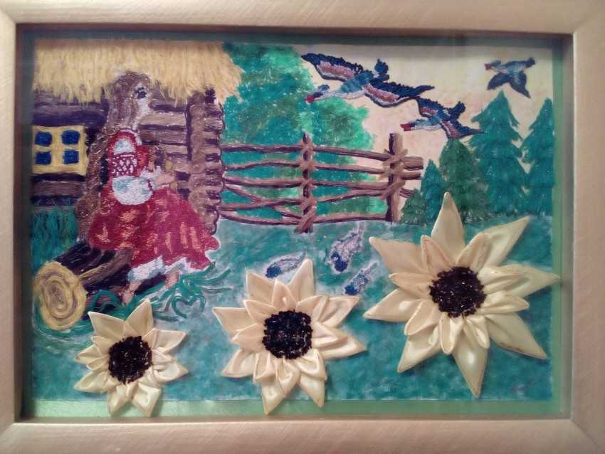 - вышивка лентами — создание панно с помощью специальной иголки с большим ушком, куда вместо ниток вдеваются атласные полоски;