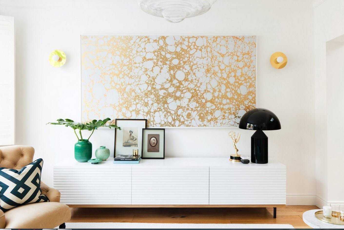 Интерьер в стиле фьюжн с разнообразными небольшими картинами ручной работы