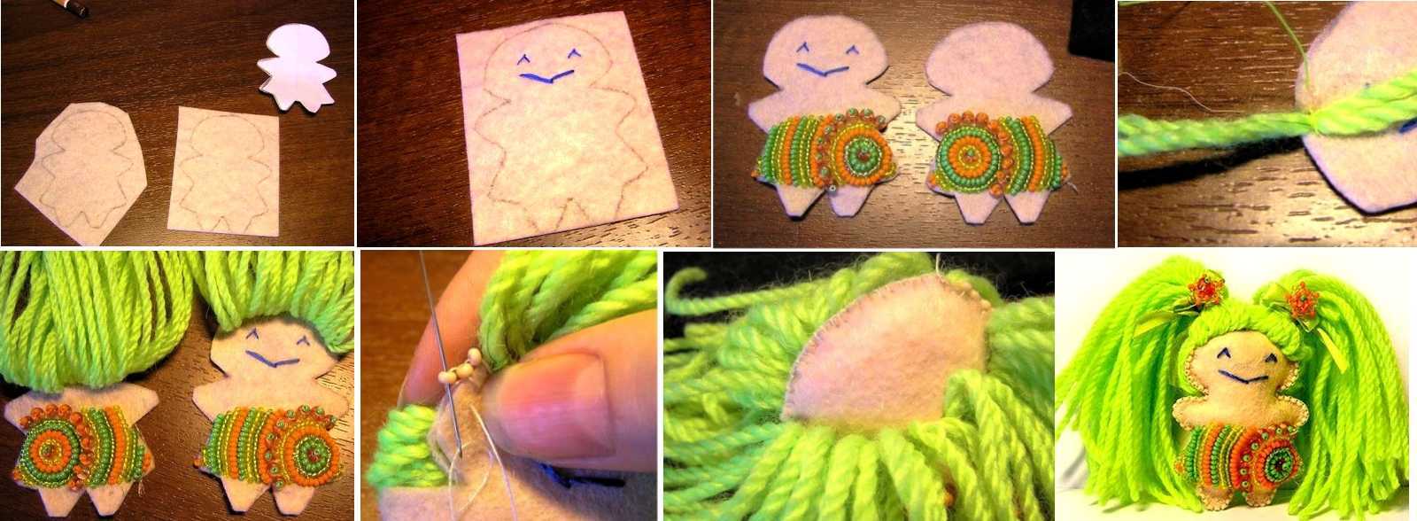 Волосы маленькой куклы из фетра прошивают по линии затылка