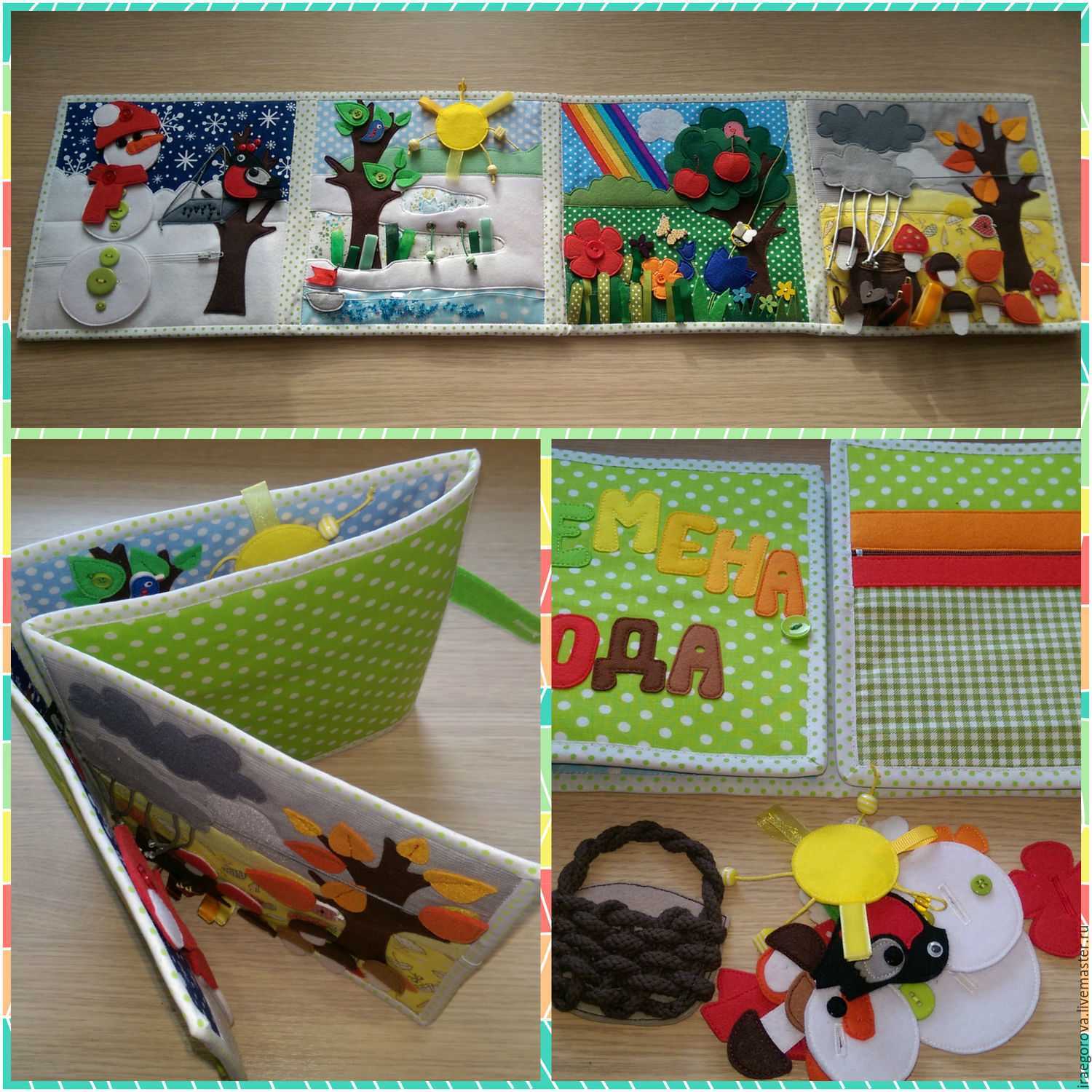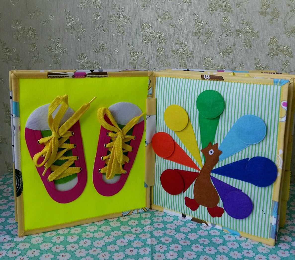 Как сделать: Вырежи несколько отрезов разноцветной ткани 20х40 см (либо того размера, какие хочешь страницы). Укрась их буквами или детальками из фетра, фигурками на липучках, молниями, кнопками, мехом, перьями, кисточками, шнурками, бахромой и вязаными игрушками.