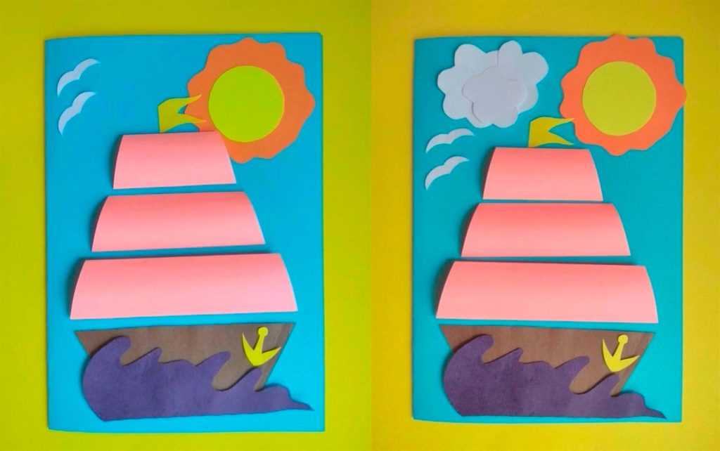 Помимо основных поделок, можно сделать аппликации корабликов из цветной бумаги своими руками. На это потребуется меньше времени и сил.
