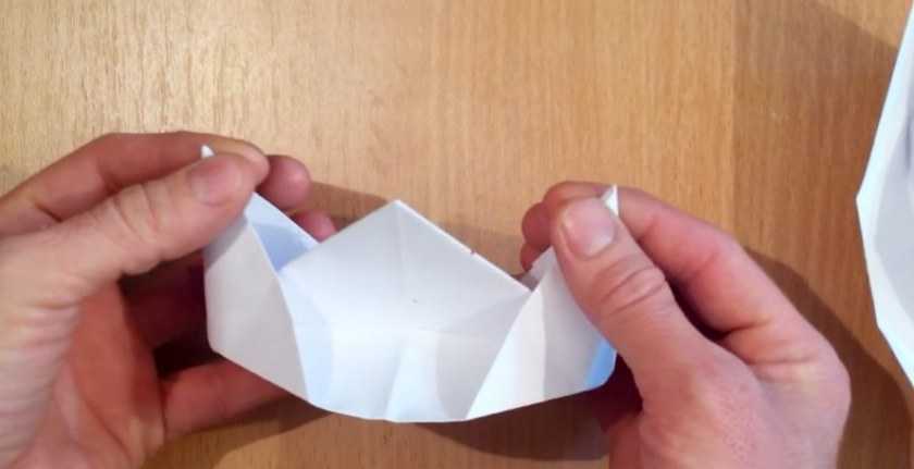 Чтобы заготовка превратилась в кораблик, осторожно возьмите пальцами ее половинки, потяните: правую к себе, левую в противоположную сторону.