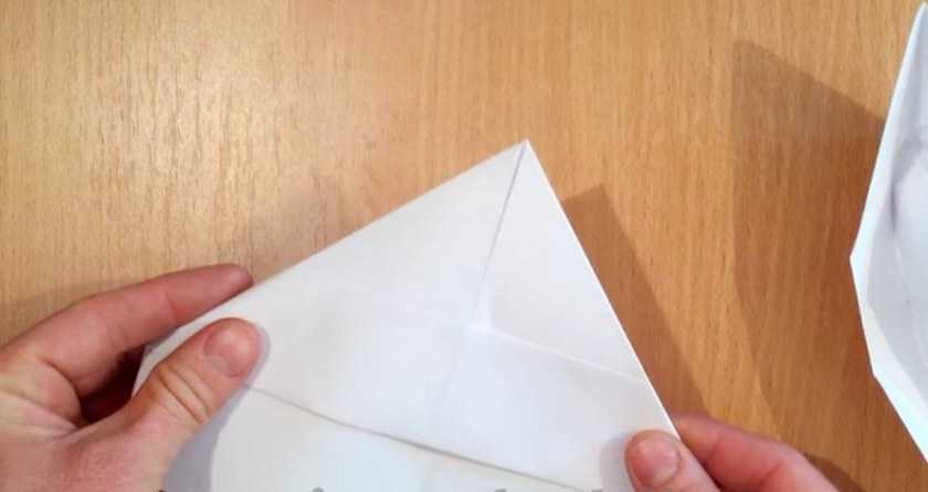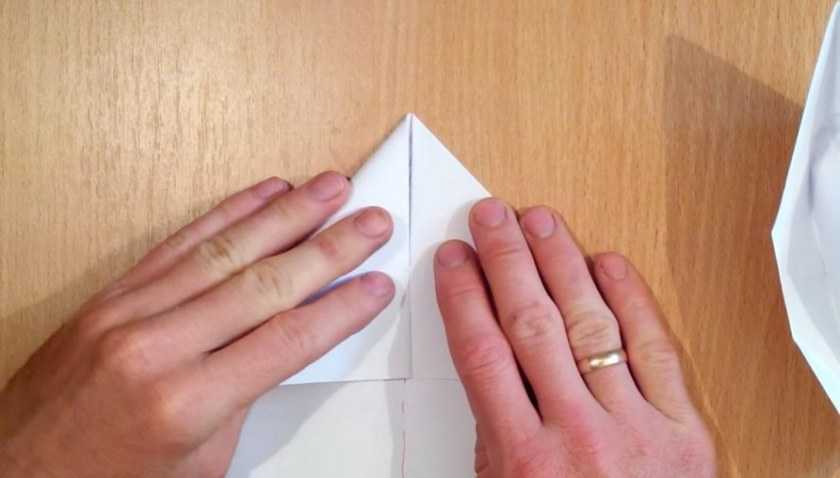 Теперь придерживая пальцем самую середину нашего листа, сворачиваем сначала один край углом, затем второй, хорошо проводим пальцем и снова разворачиваем лист.