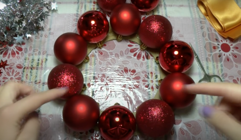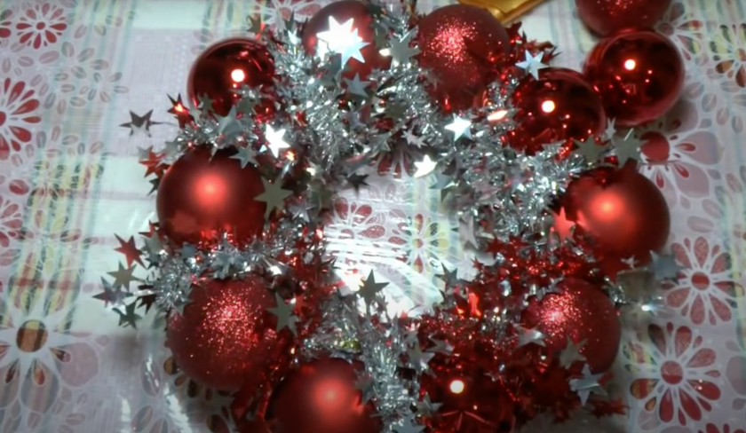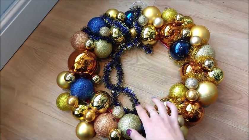 Такой вариант делается быстро и просто. Вам нужно найти проволочную вешалку и с помощью плоскогубцев выгнуть ее в форму похожую на круг. Также запаситесь елочными шарами разного размера. Вам понадобится 50-60 штук. Остальной декор опционален.