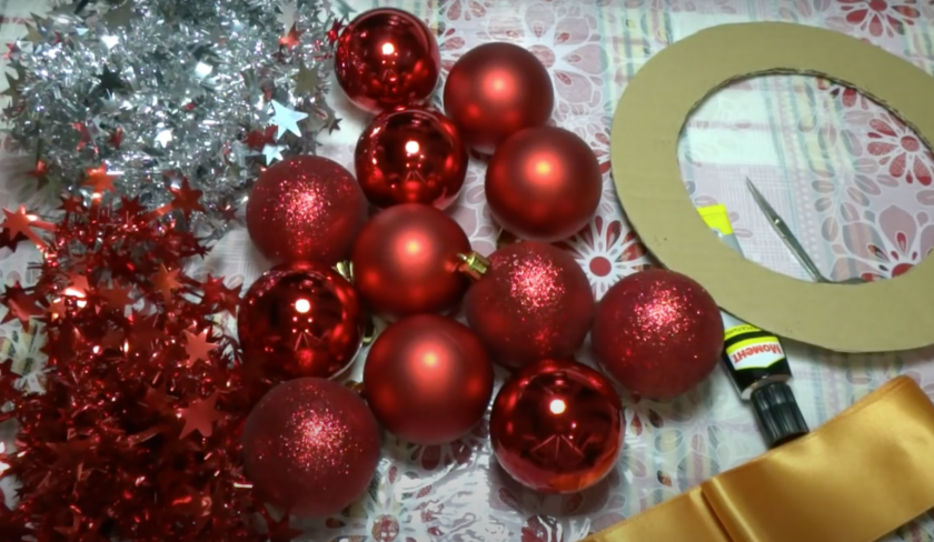 Сейчас расскажу вам как можно сделать такой аксессуар, используя плотный картон и мишуру, а также елочные шарики.