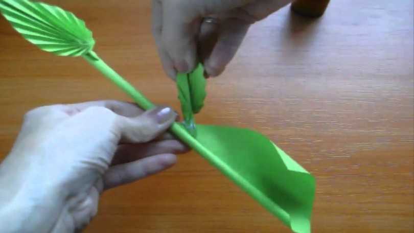 - Короткие ленты зеленого оттенка в количестве двух штук соединяются, на них изображается лист, далее он вырезается по контуру с помощью острых ножниц.