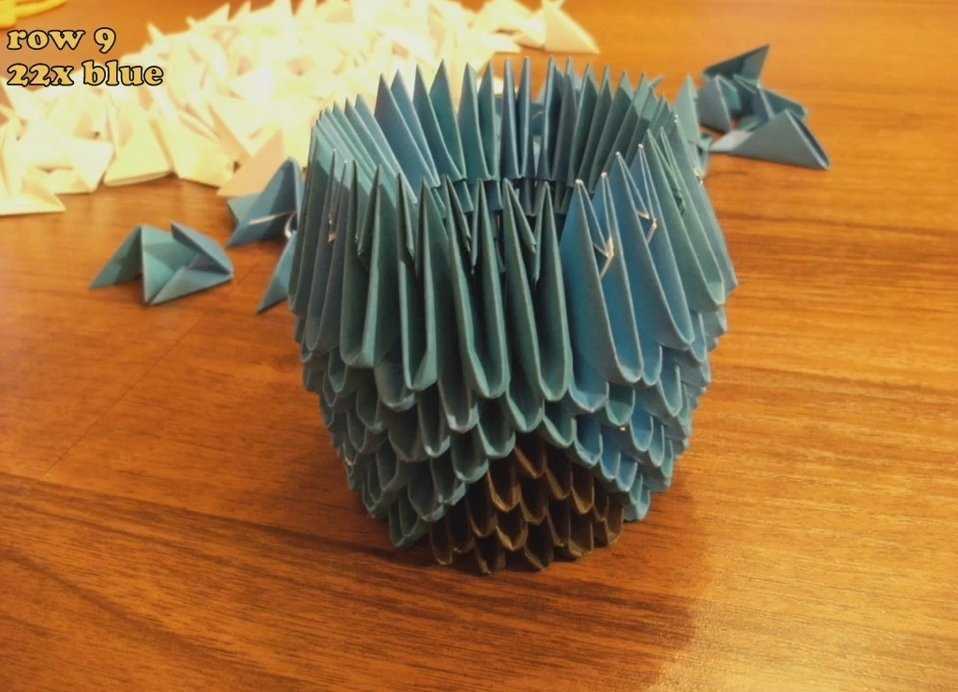 Для маленькой птички необходимо заранее сделать 228 треугольных модулей такого же размера, как и в предыдущей схеме. По схеме делать сову из модулей в оригами не так уж сложно, как кажется на первый взгляд. И намного легче создавать модульное оригами «Сова» по схеме сборки совместно с родственниками или друзьями.
