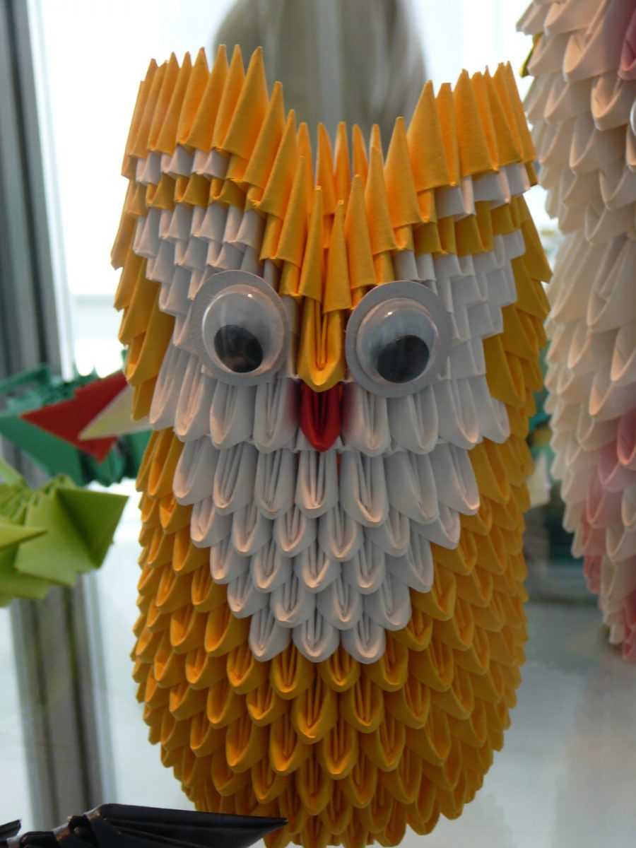 Сова по этому варианту сборки получится без лапок, но можно добавить их, взяв описание из предыдущего способа. Ещё схемы сов из модулей оригами можно дополнять разными небумажными деталями. Например, сделать глазки не как описано, из бумаги, а приклеить уже готовые. Они продаются в отделах для рукоделия, и позволяют сделать мордочку поделки более выразительной.