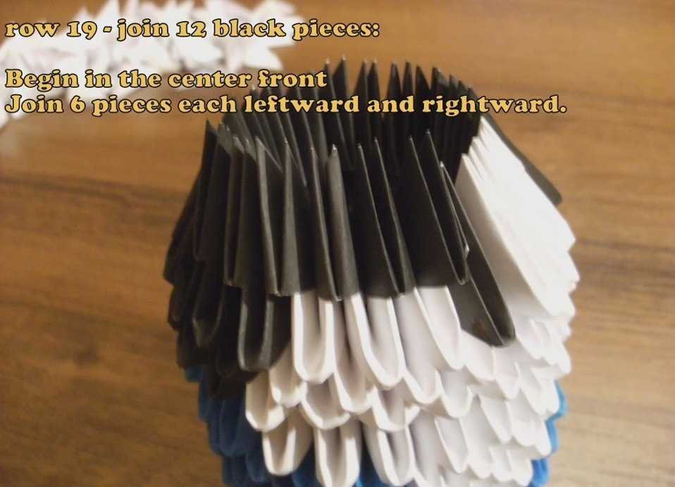11) Делаем восемнадцатый ряд: на 2 центральных модуля надеваем 1 черный длинной стороной наружу. С обеих сторон от него надеваем по одному черному и по 4 белых модуля короткой стороной наружу. И ряд снова закончим черными модулями, надетыми длинной стороной наружу. И дальше начинаем делать уши для птицы, оставив свободными 4 центральных модуля. Для этого надеваем 6 черных модулей короткой стороной наружу.