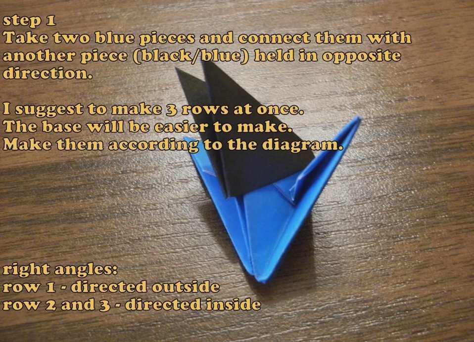 - Закрепите поделку, вставив между крайними углами следующий ряд модулей. Для этого добавьте сверху на нижний ряд 10 белых, и 18 синих элементов. Это будет первый ряд.