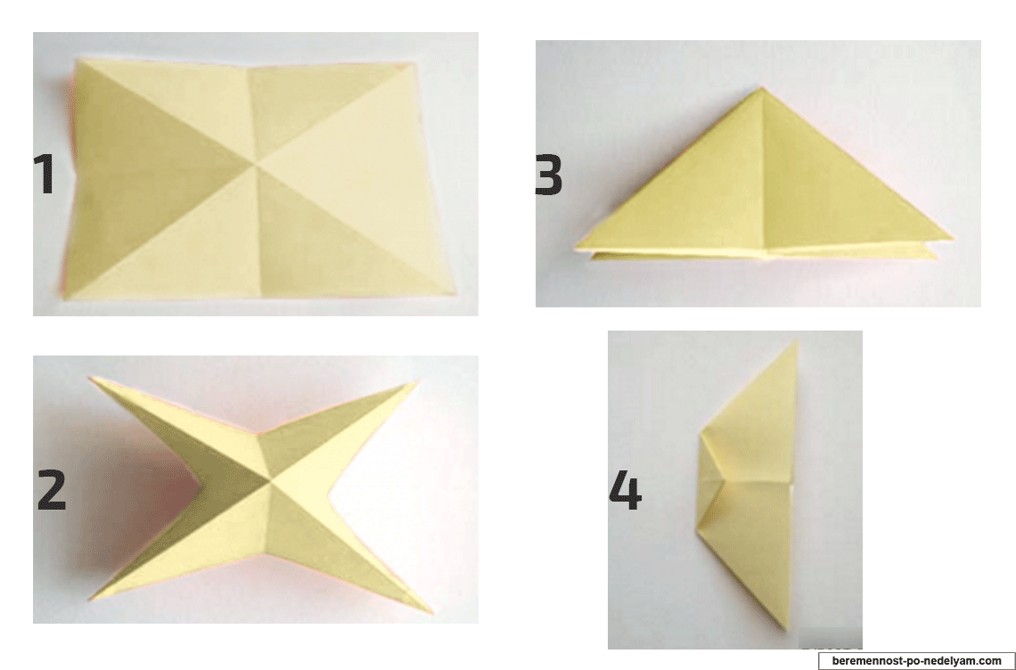 1.Согнуть листок дважды по диагонали, дабы промять складки.