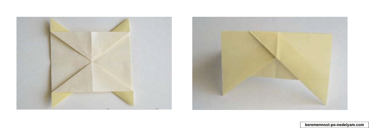 Переверните деталь, заверните второй прямоугольник кверху, закрыв торчащие уголки. Раскройте поделку, а затем сожмите, придав ей квадратную форму.