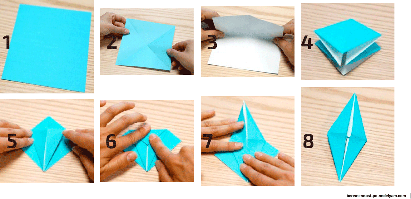 Возьмите лист квадратной формы и поверните его так, чтобы он напоминал формой ромб. Далее согните его по диагоналям и пополам там, чтобы лист образовал собой равносторонний треугольник. Острые боковые стороны треугольника согните по направлению к центральному углу. После этого захватите все три уголка и поверните их в направлении к себе.