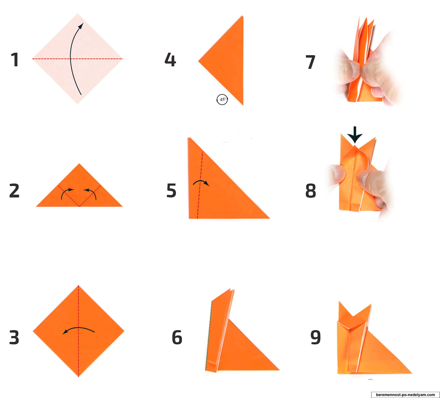 И в заключении лёгкий вариант кошки. Согните оранжевый квадрат 9Х9 см пополам, чтобы получился треугольник.