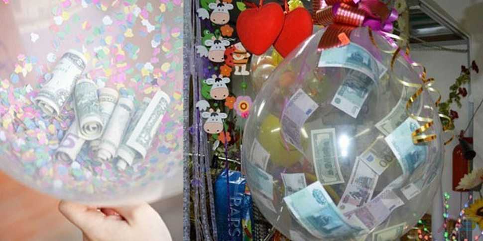 Деньги в воздушном шарике. Понятно, что до того, как надуть шарик, в него нужно засунуть несколько свернутых или сложенных в гармошку купюр, это совсем не сложно. А для красоты туда же можно добавить какие-нибудь легкие блестки и завязать шар бантом.