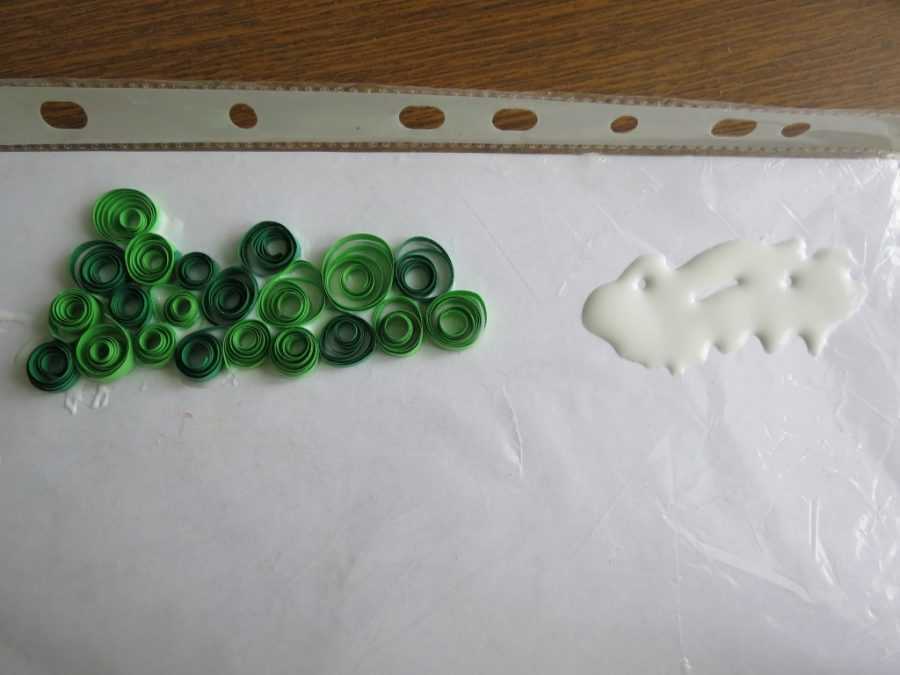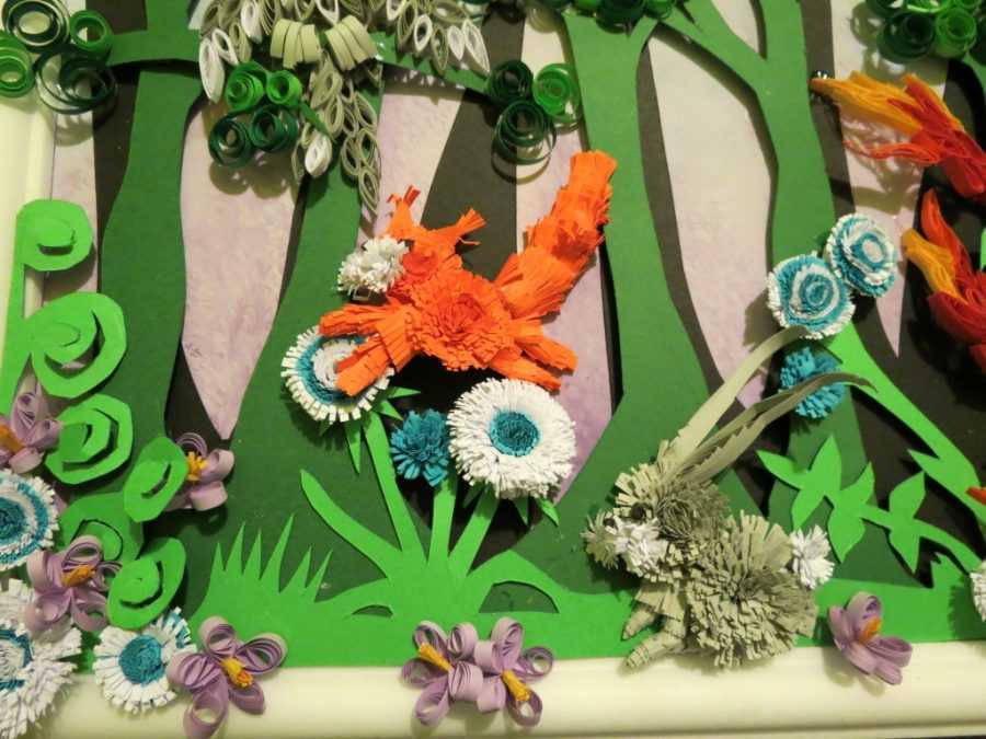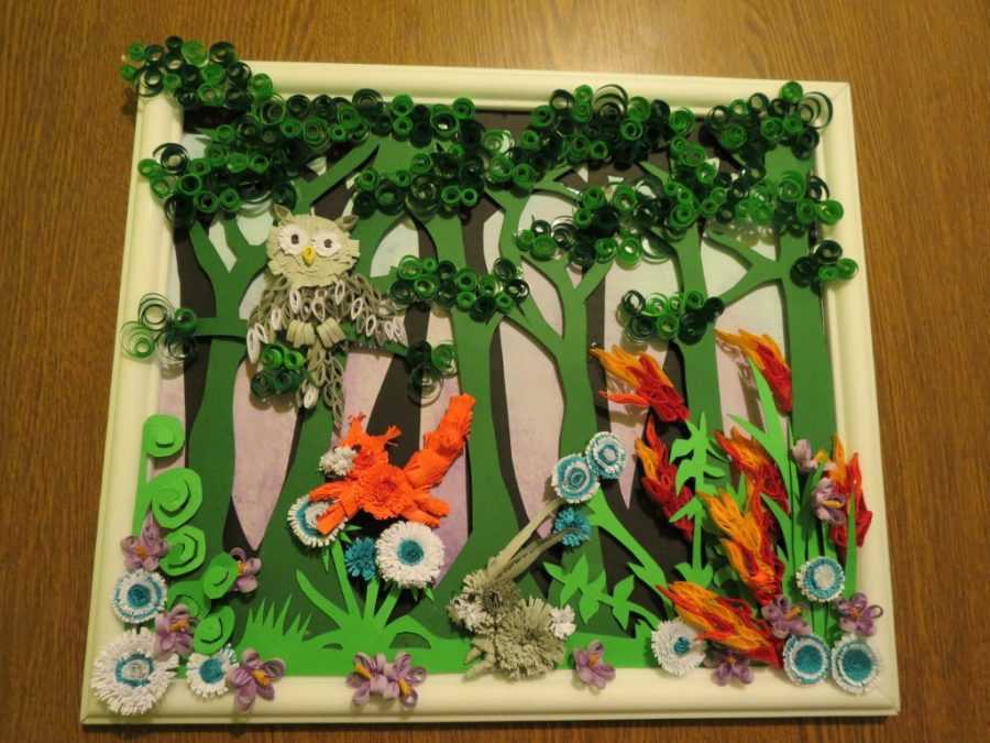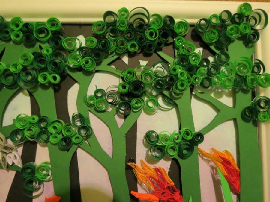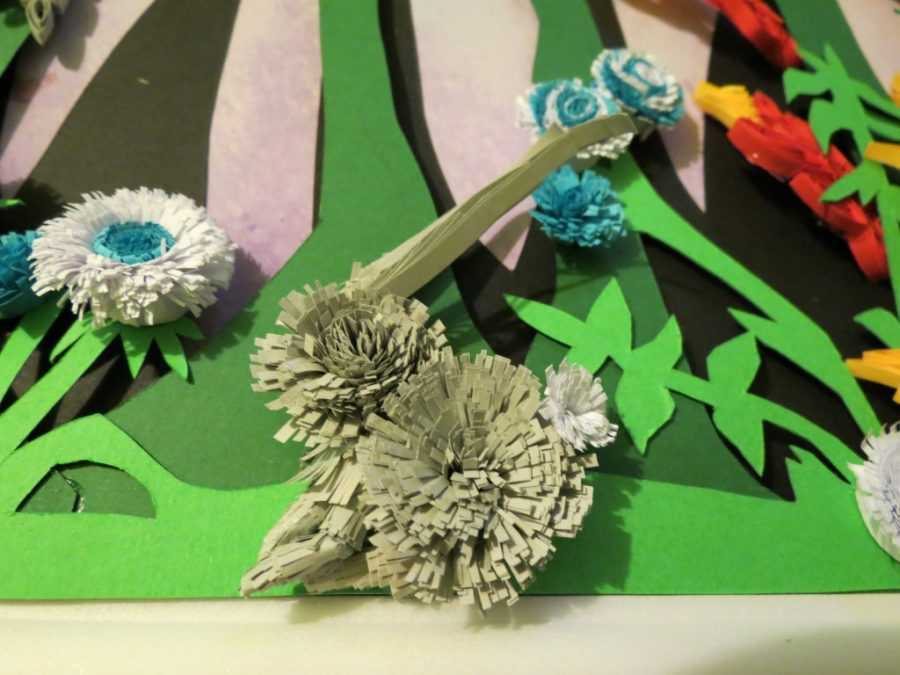 Для изготовления таких поделок нужно нарезать полоски необходимых цветов шириной от 3 до 10 мм. Далее, нужно разместить скрученные полоски и их концы закрепить клеем. Все объемное изображение в конце размещают на основе (картоне) и фиксируют с помощью клея.