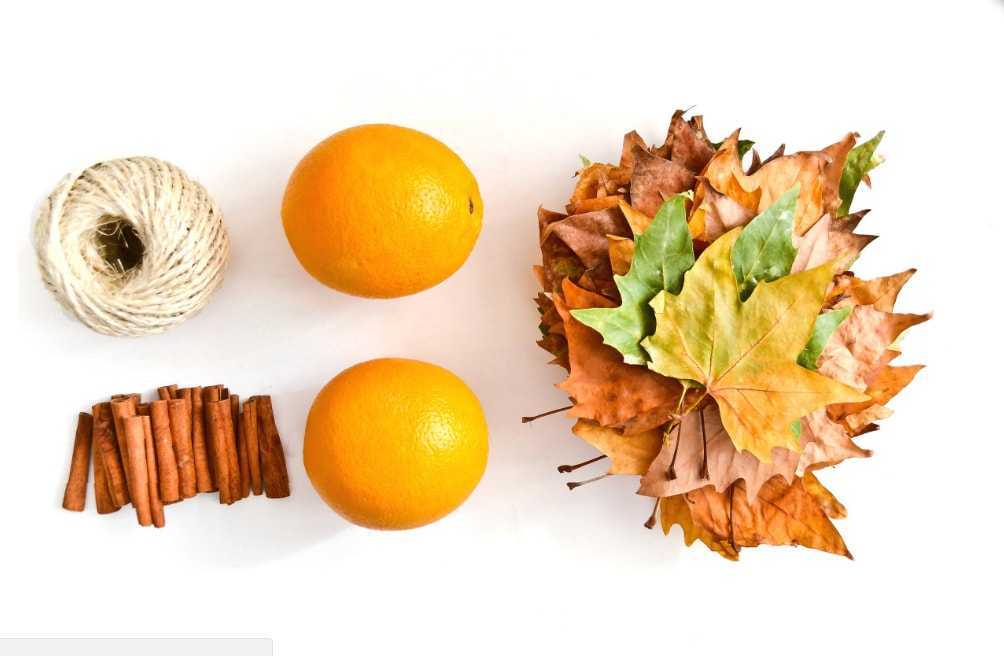 Добавляем дольку апельсина, несколько листьев и после этого прикрепляем две палочки корицы. Для этого оборачиваем их веревкой и завязываем узел.