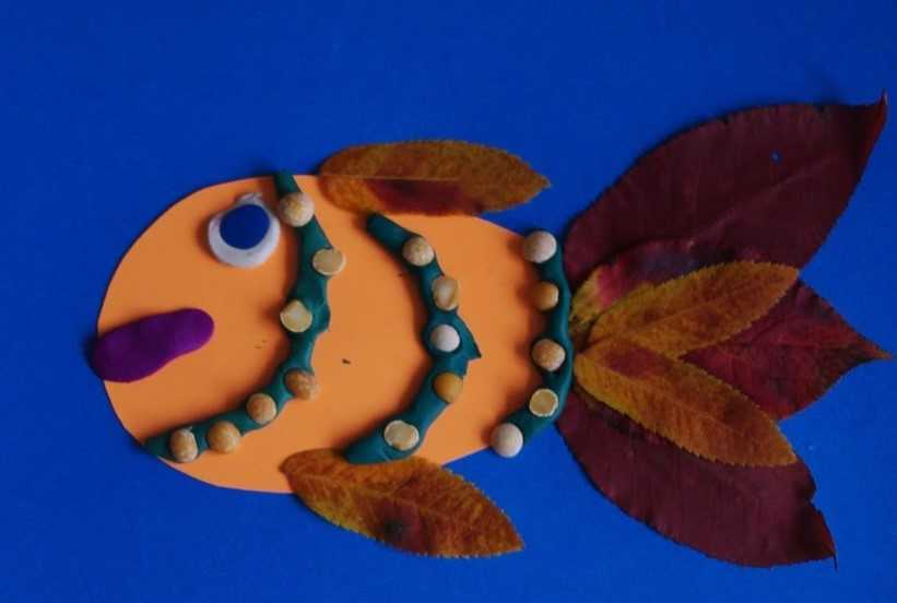 Аппликация рыбка – это отличная композиция из листьев для 1 класса. На основу из картона голубого цвета по краям приклеивают засушенные веточки растений, похожие на водоросли. Из листьев разного размера составляют рыбок. Например, красивая рыбка получится из листа вяза, как плавники используют листики рябины, хвост – из листьев ивы.