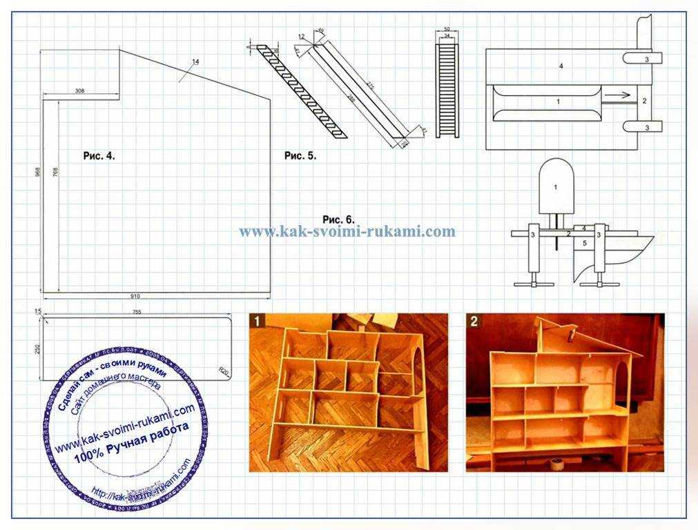После сборки всей конструкции домика из 3-мм фанеры по месту вырезают заднюю стенку (рис. 4) и прибивают маленькими сапожными гвоздями к задним кромкам перегородок и полок, крепят крышу.