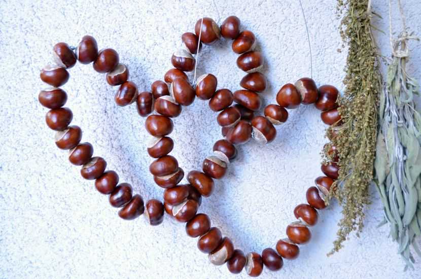 Для изготовления сердца нам понадобятся плоды и проволока. Нанизываем каштаны, предварительно сделав отверстие и гнем изделие чтобы придать форму сердца. Ярче и красочнее работа получится если расписать каштаны красками, или нарисовать на них узоры. Можно вырезать форму сердца из картона. Вокруг картона закрепить наше изделие, а к картону с двух сторон приклеить плоды. Оставшиеся пустоты заполняем бусинками, семенами тыквы, фасоли или любой другой крупой. Если к сердечку прикрепить веревочку, то его можно использовать и как новогоднее украшение.