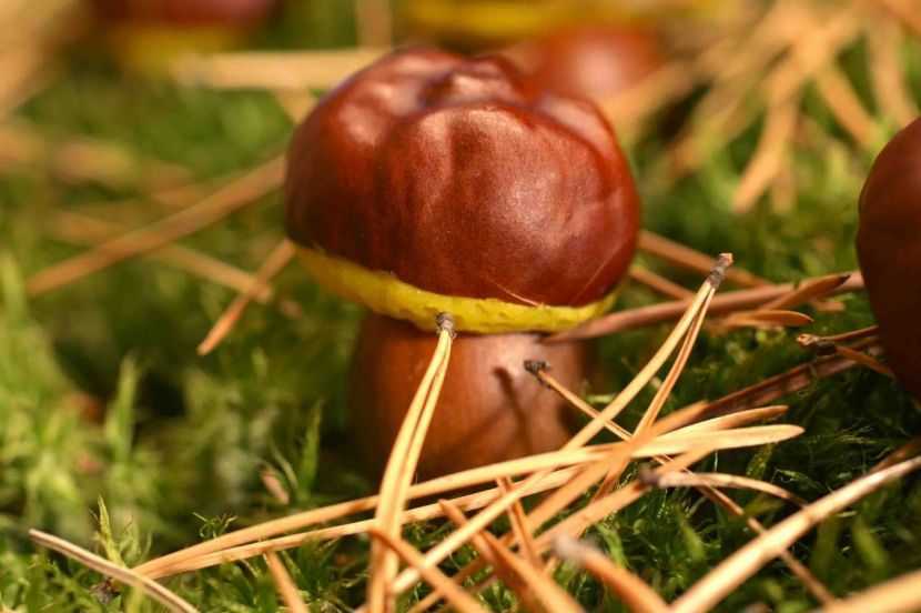 Ну и наконец еще одна несложная идея — это, конечно же, грибы из каштанов. С чем еще ассоциируется, как не с грибами, осенний лес? Стоит отметить, что каштаны — идеальный материал для из создания, и грибочки получаются действительно очень реалистичными.