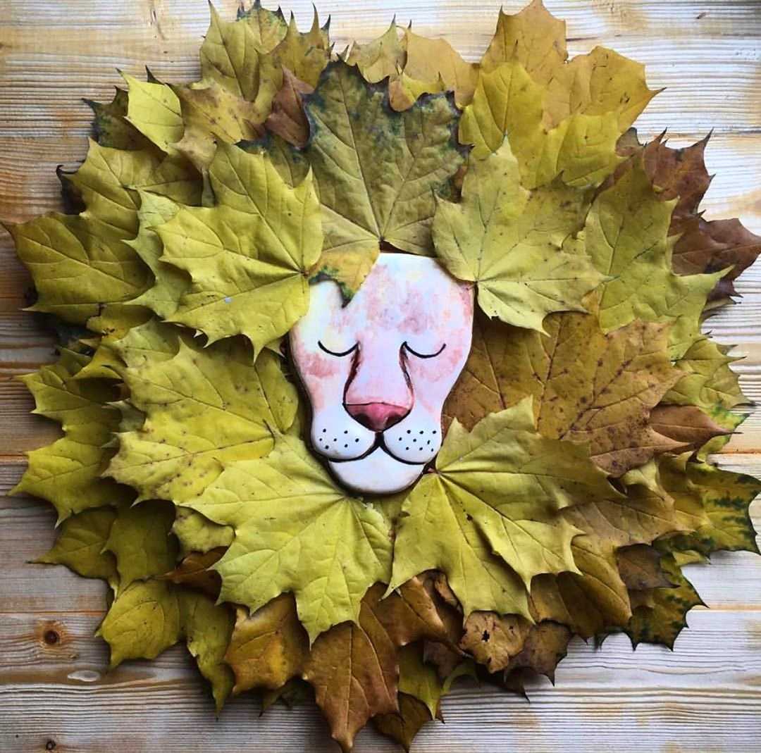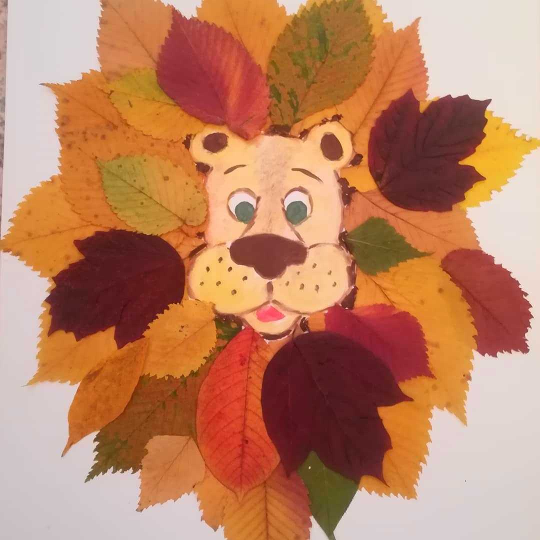 Схема льва мало отличается от варианта с солнышком. Мордочкой может стать кленовый лист или предложенная преподавателем заготовка — шаблон, который надо обвести, или готовый распечатанный контур.