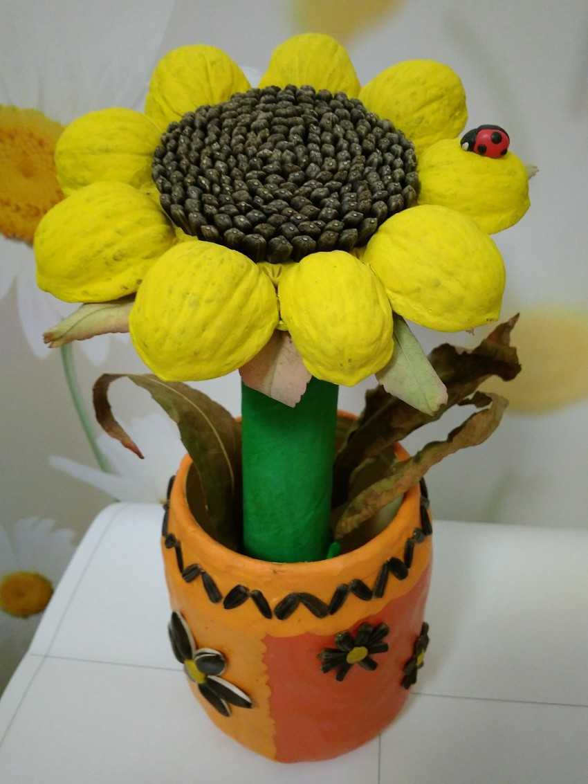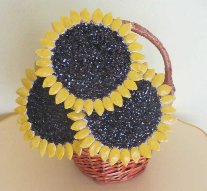 На тему весны легко сделать и вазу с цветами – точно так же, как и корзинку. Чтобы детские поделки из семечек долго хранились и не осыпались, можете побрызгать их лаком для волос или покрыть прозрачным лаком для ногтей.