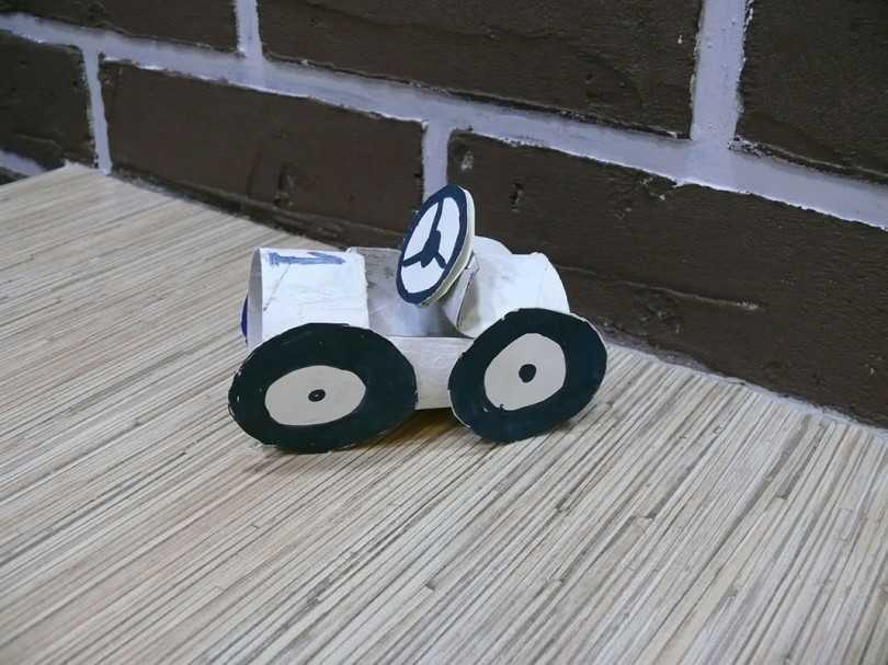 Малышу можно предложить сделать собственную машину, для этого нужно вырезать из втулки небольшое отверстие сверху, будущее место для водителя, окрасить в интересный цвет, после чего приклеить с обеих сторон колеса из картона и руль.