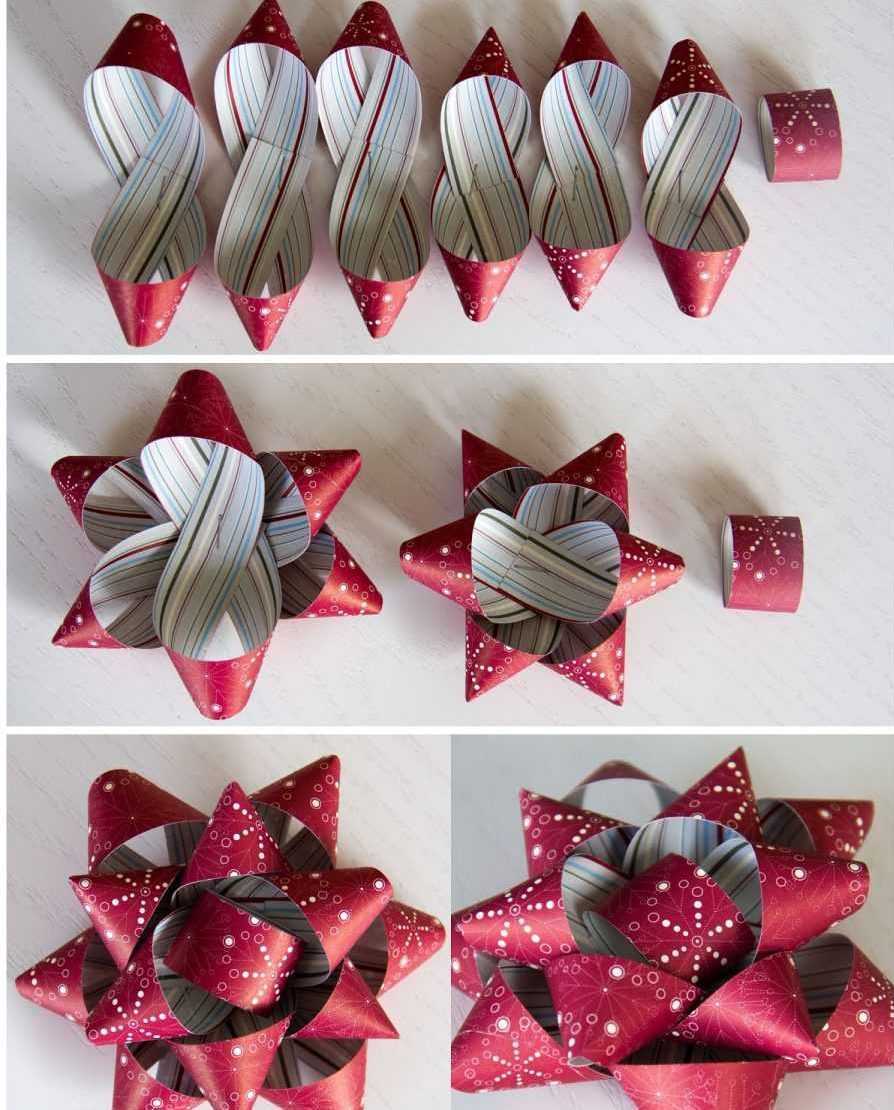 Теперь не хватает только середины петли. Для этого вы отрезаете полоску оберточной бумаги размером примерно 6х1 см. Затем вы склеиваете их вместе, чтобы сформировать кольцо, которое затем приклеиваете к середине петли. Готово! Можно приклеить такой бант на упакованный в бумагу подарок.