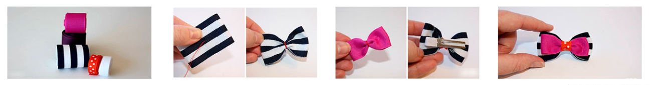 Разберем подробно, как сделать нарядный бант своими руками. Для создания изящного аксессуара приготовить тонкие ленточки разных оттенков. Например, взять бордовую, розовую и белую ленту.