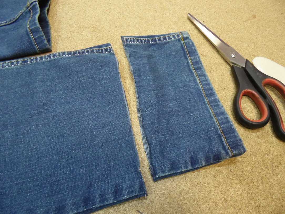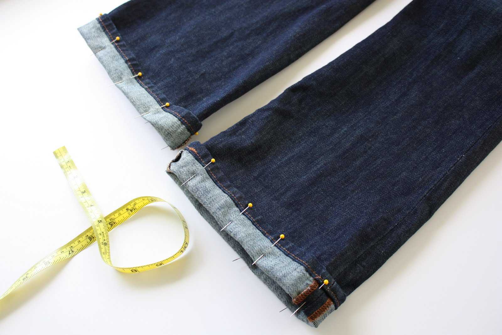В случае с джинсами как прямого, так и расклешенного кроя достаточно будет просто срезать все лишнее по прямой, оставив на подворот 3-5 см. То же касается и укороченных брюк.