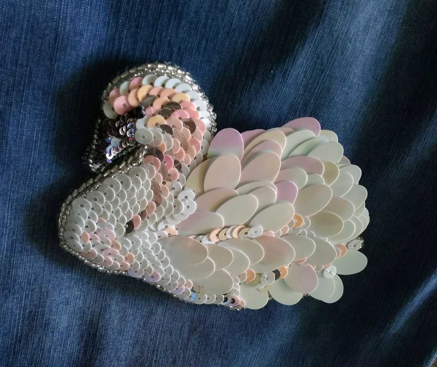 Работая в этой технике, выбранные пайетки к поверхности ткани получается пришить максимально аккуратно. Стежки на готовом изделии незаметны. Поэтому оно выглядит симпатично.
