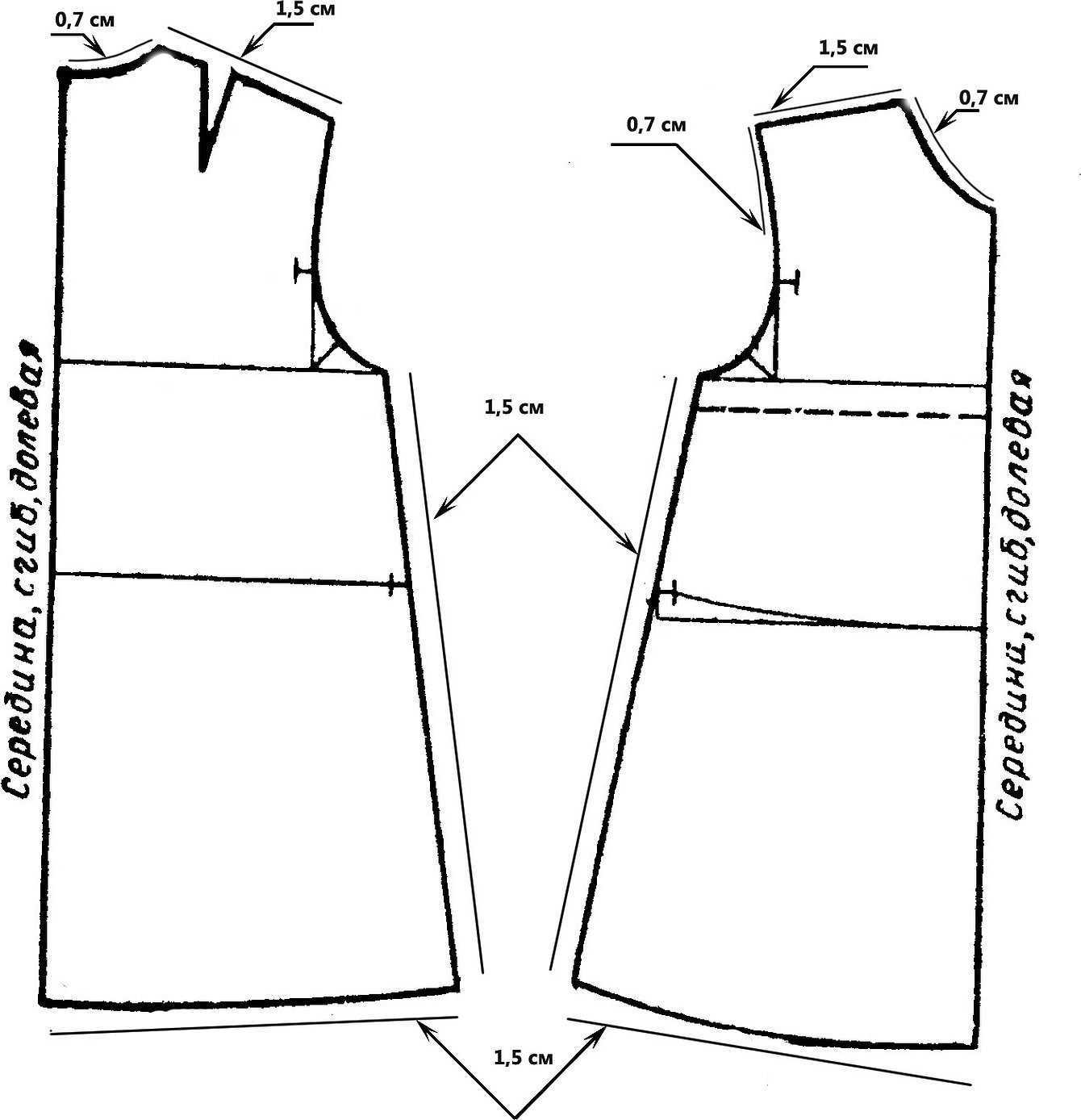 Ширина горловины, как правило, требует прибавки от 1 до 5 см в зависимости от телосложения человека. Линии на чертежах выкройки выделяют латинскими или русскими буквами.