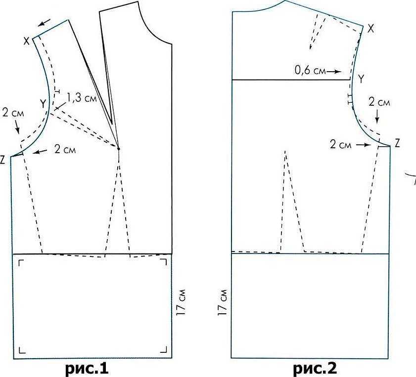 - углубляется пройма на спинке на 1 см и проводится новая линия проймы;