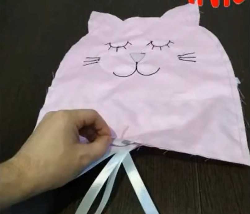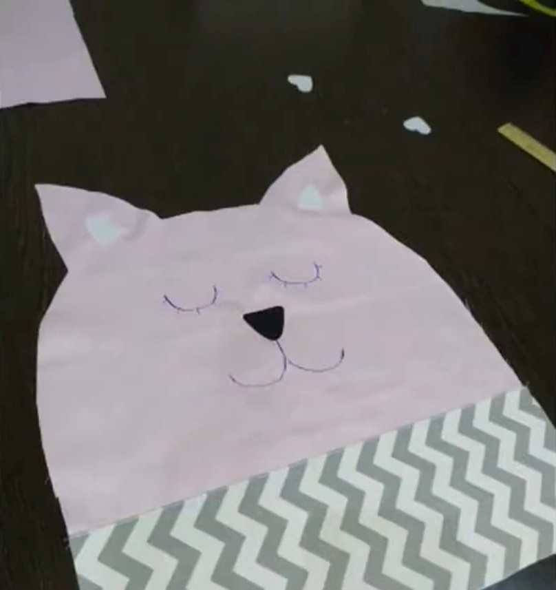 Нарисуйте глаза, рот, усы на изделии с помощью мыла, мелка или терморучки, которая легко стирается. Для лучшей симметричности лучше воспользоваться линейкой. Далее прошейте толстым швом нарисованные черты лица. Сделайте щеки из фетра и прострочите их светлой нитью. |