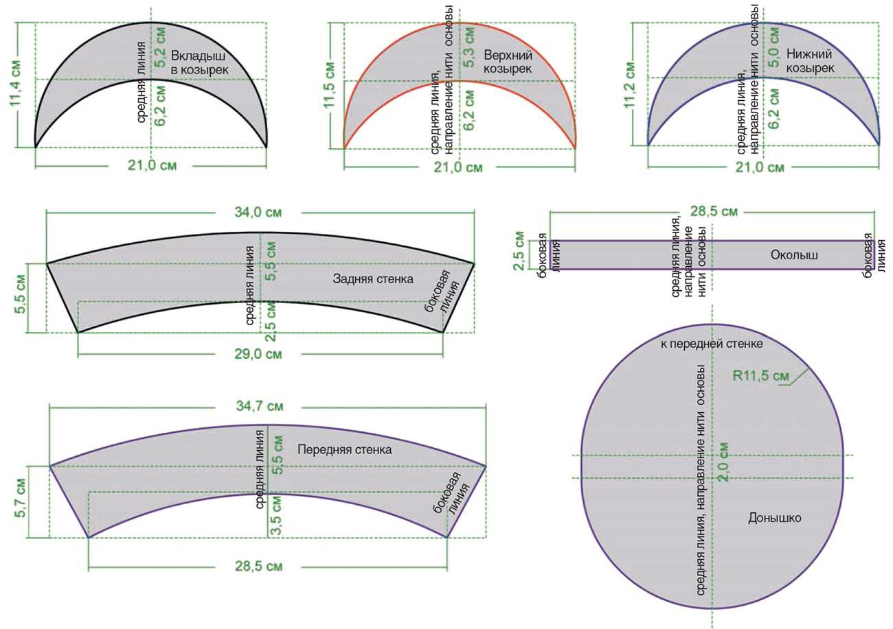 К сведению! Таким образом, для выкройки кепки женской с козырьком необходимо сделать 6 лекал для клиньев, составляющих верхнюю часть кепки, 2 лекала для околыша и 2 – для козырька.