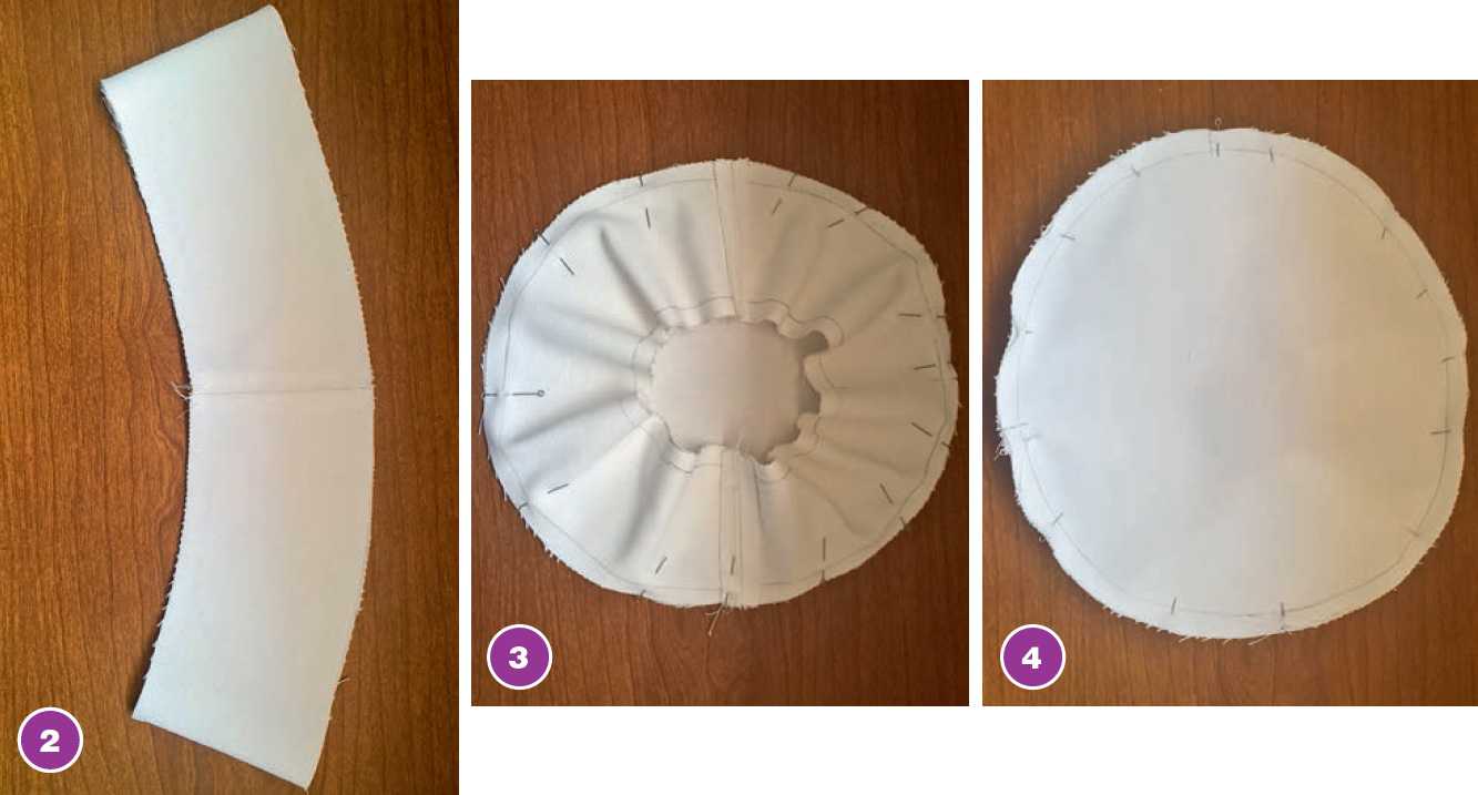 - Сострочить все клинья из основной ткани боковыми сторонами, так чтобы получилась полусфера, сложив их предварительно лицевыми сторонами внутрь. По желанию их можно настрочить или приутюжить. Так же поступить с деталями подкладки.