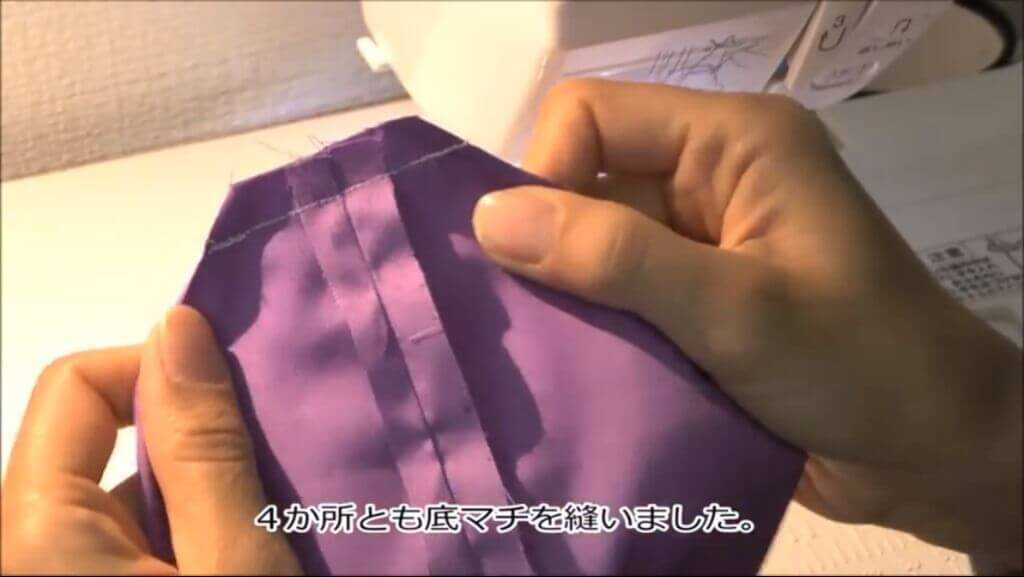 Дно пришивается вручную к краю заготовки. Уголки прикрепляются к нему, учитывая длину строчки. Чем она длиннее, тем уже получится дно рюкзака.