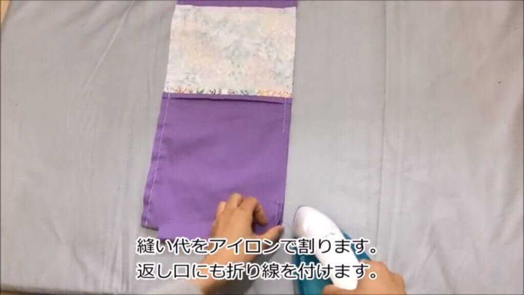 Разворачиваем работу и переворачиваем её, сгибая подкладку пополам. Уголки получаются внизу. Затем нам нужно прошить боковые стороны, как показано на фото, оставив справа не прошитое место. Не забудьте вставить по ходу работы в нужные места шлёвки с полукольцами. Это должно быть с 2-х сторон возле дна.