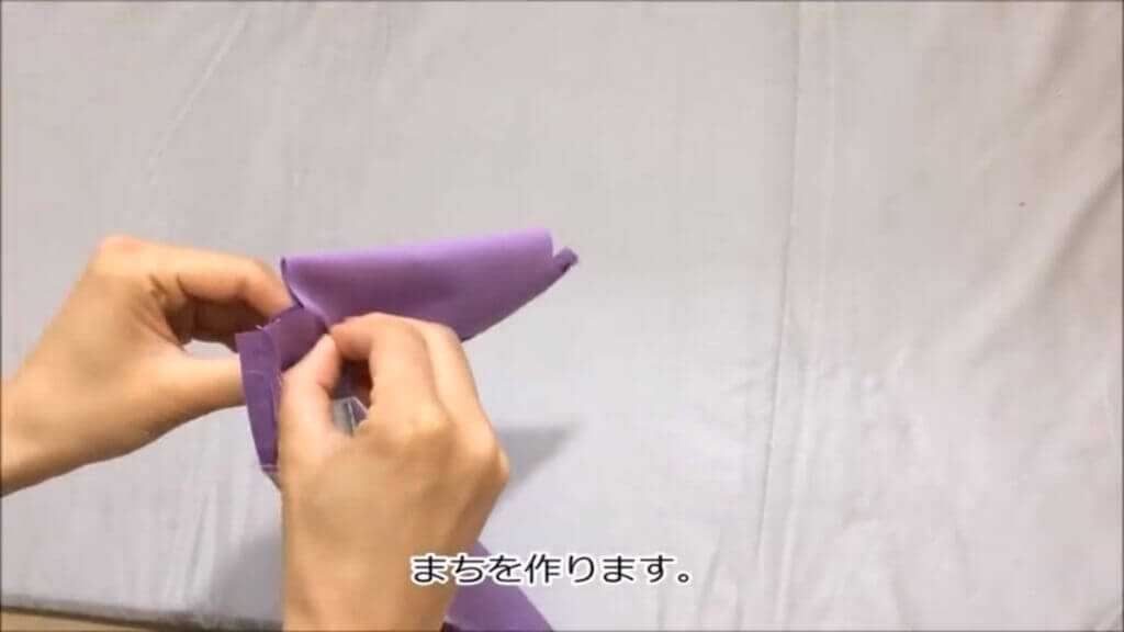 Далее, необходимо оформить дно рюкзака: берём работу в руки и ткань на вырезанном углу расправляем так, чтобы получилось 2 вот таких, как бы срезанных “треугольника”. Стачиваем оба уголка на ширину в 1 см.
