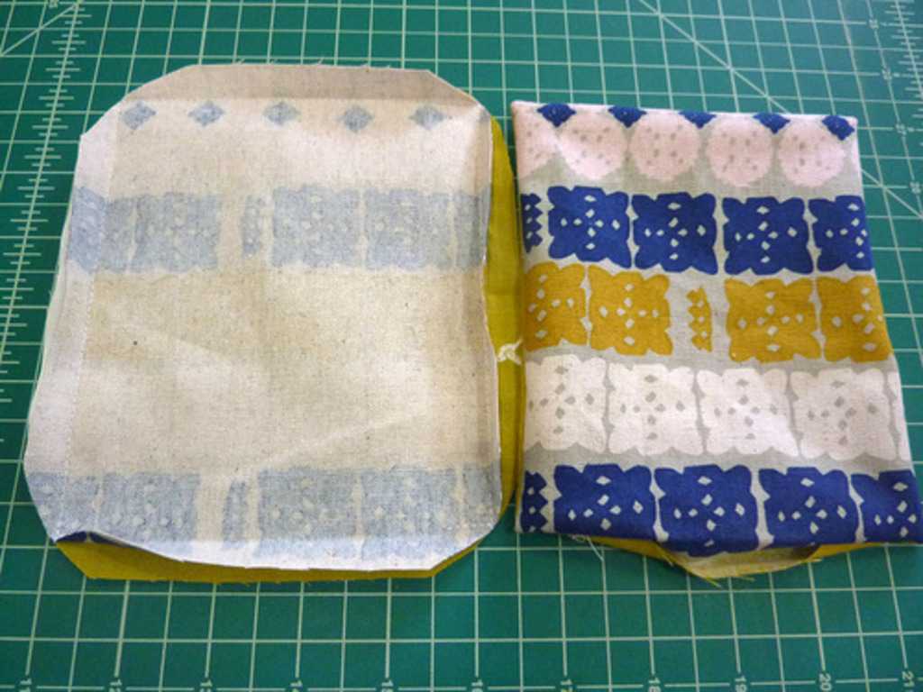 - Основу складывают лицом внутрь, совмещают низ и прошивают на машинке. Шов разутюживают, складывают углами по бокам и создают объем: прокладывают строчку от одной боковины до другой под углом 45 градусов перпендикулярно разутюженному шву. Лишнюю ткань обрезают. То же самое делают с подкладкой. Затем ее соединяют с основой (по верхнему краю), совмещая швы с помощью швейных булавок, и прошивают срез на машинке.